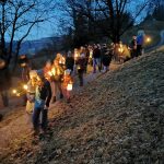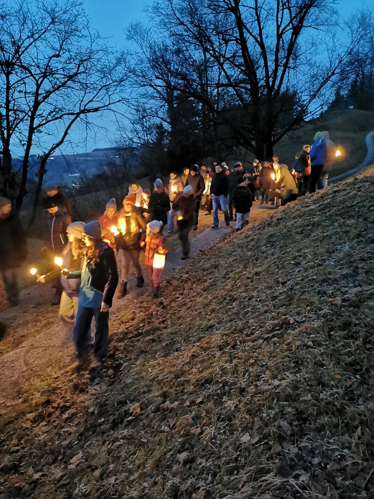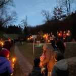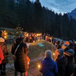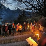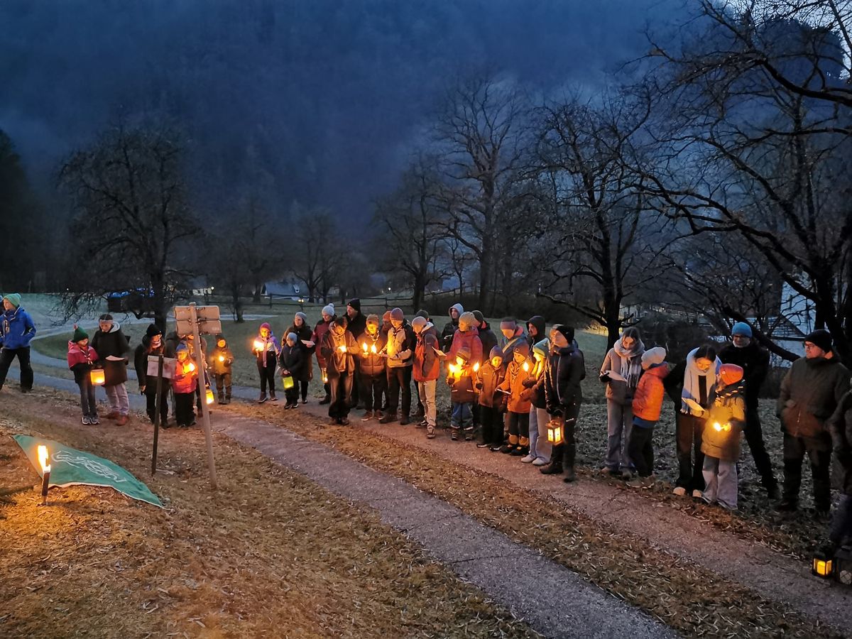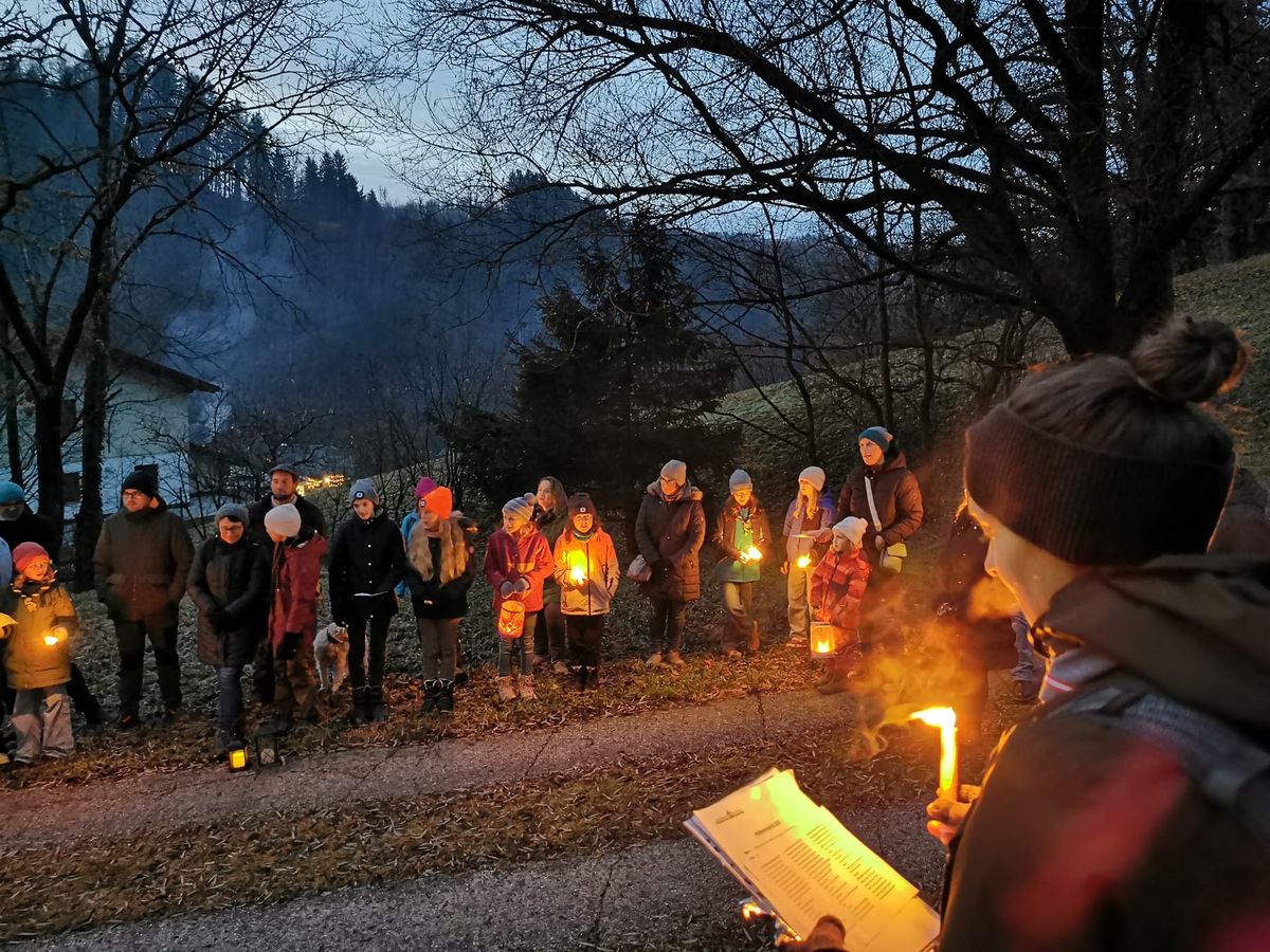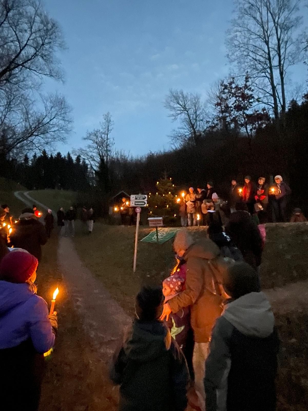 Bei Einbruch der Dämmerung machten wir uns, mit Fackeln und Laternen, auf den Weg zum Goldfischerlteich. Dort wartete auf uns schon der beleuchtete Weihnachtsbaum. Beim Goldfischerlteich stimmten wir uns mit Liedern, besinnlichen und lustigen Texten auf die Weihnachtszeit ein.